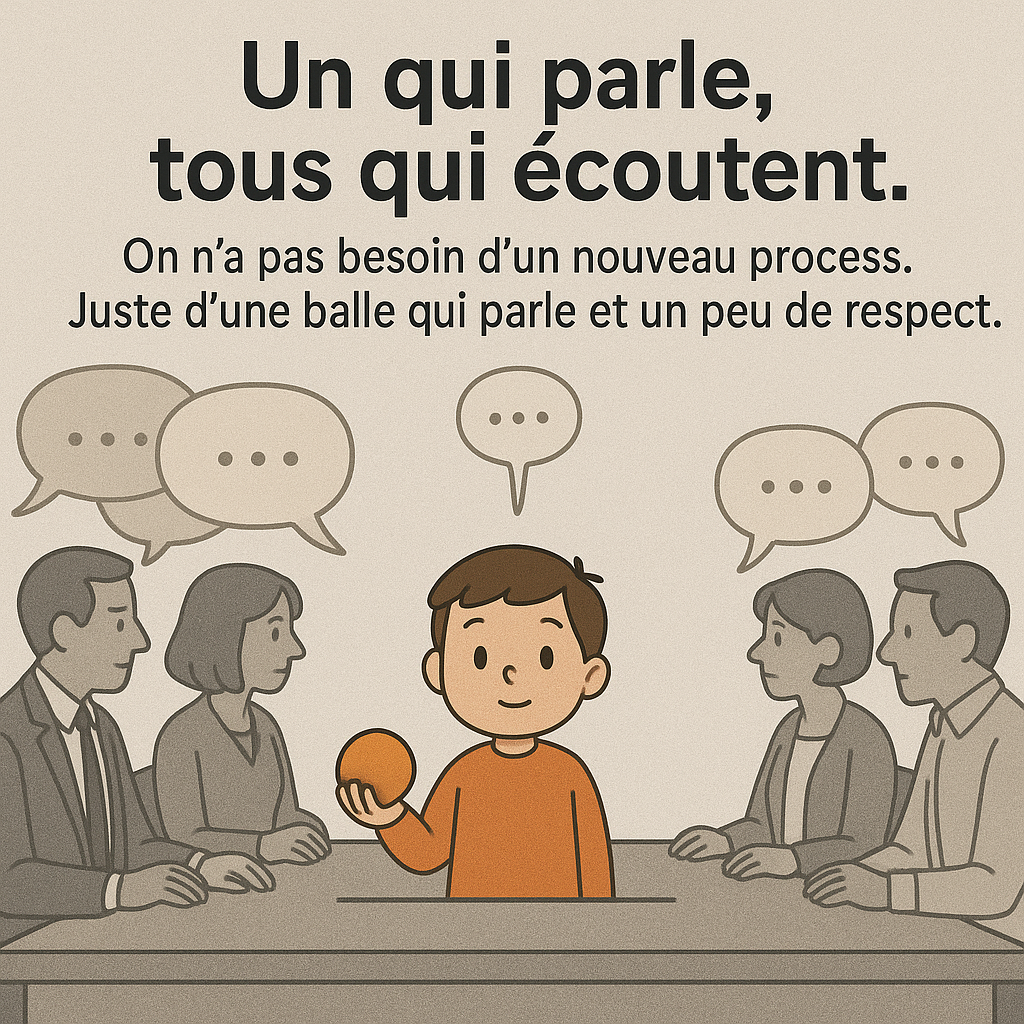— « À l’école, quand on parle tous en même temps, la maîtresse elle sort la balle qui parle. Celui qui a la balle, il parle. Les autres, ils écoutent. Vous voulez que je vous montre ? »
