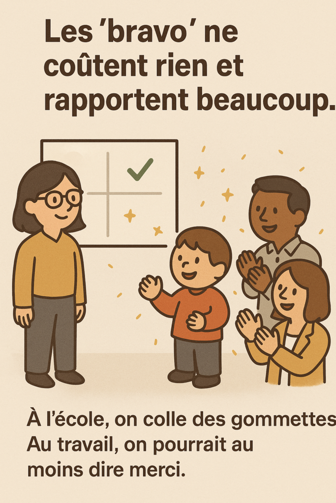 — « Je voulais juste dire bravo à Julie qui a bouclé le dossier DUPOND. C’était costaud. Merci. » Julie rougit, les autres applaudissent.